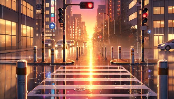 雨にぬれる黄昏時の都会の幻想風景_背景画