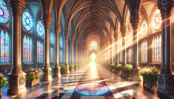 夕映えに染まる宮殿の高貴な大広間_背景画