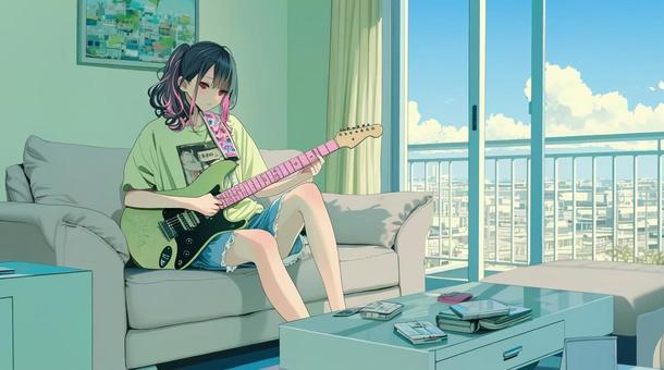 部屋でギターの練習をする女の子