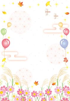 秋桜と秋の草花と夕焼けのフレーム(縦)