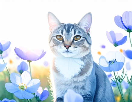 花に囲まれる猫