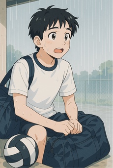 雨宿りする学生
