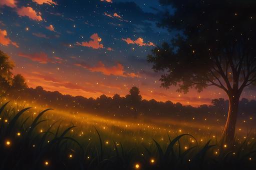 金色の蛍の光が灯る黄昏時の草原と森_背景