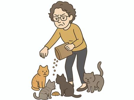 野良猫に餌を与えている中年女性