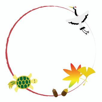 秋の和風フレーム05 円形 紅葉と鶴と亀