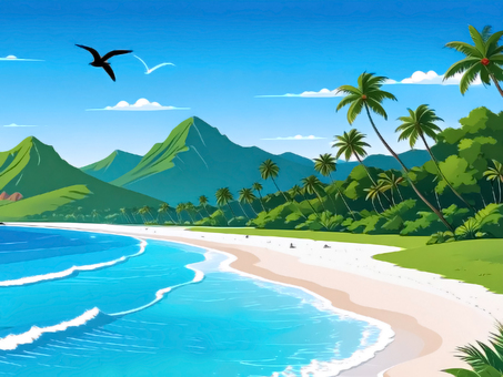 南国の島と海と鳥と椰子の木のイラスト