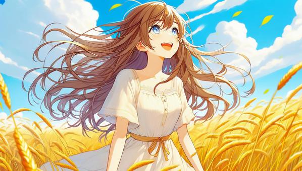 麦畑で空を見上げる少女