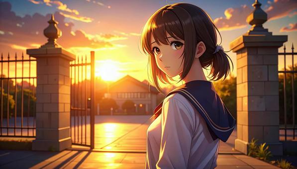 夕日と振り向く少女