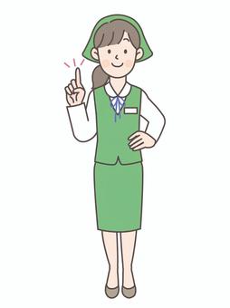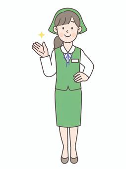 腰に手を当てて案内する事務員_全身