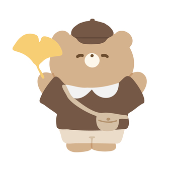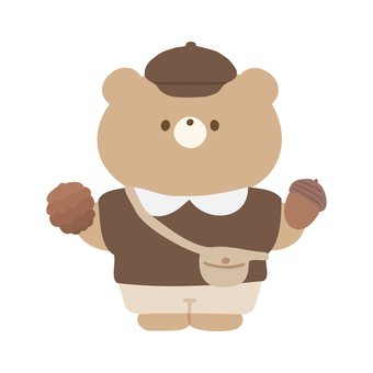 松ぼっくりとどんぐり持つ秋服姿のくまさん