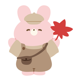紅葉の葉っぱを持った秋服姿のうさぎさん