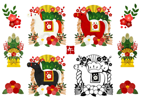 水彩風下結び注連縄ツバキに龍の年賀素材集