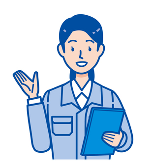 笑顔で案内する作業服を着た若い女性