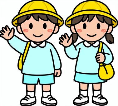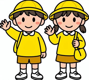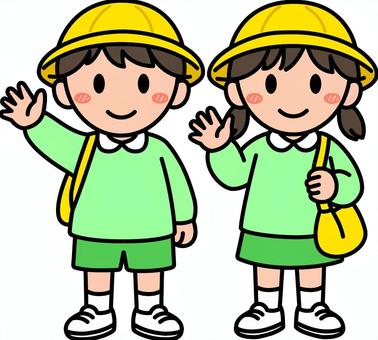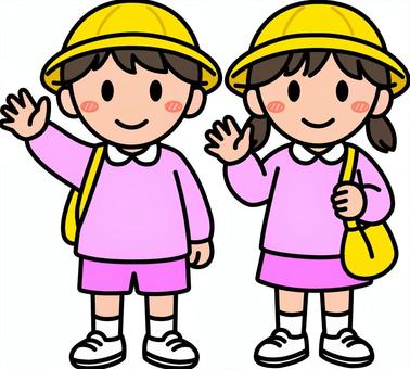 喜ぶ手をつなぎ鞄をかけた幼稚園児