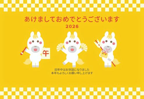 白馬のかわいい年賀状(書初_扇_破魔矢)